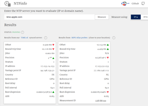Figure 1 shows a screenshot of the website. As an example, it shows the properties of the NTP service time.apple.com, which at the time had an offset of 0.5ms from the time.nl servers and 0.153ms offset with RIPE Atlas. As such, we can see that this server is accurate by comparison with both time.nl and ripe atlas vantage points.