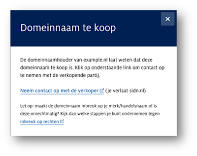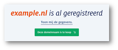 Stel, iemand is op zoek naar een leuke domeinnaam en ‘example.nl’ lijkt hem of haar wel wat. Als de domeinnaam al geregistreerd (bezet) is, dan laat de domeininformatiepagina van SIDN dat zien. Maar met het toegevoegde ‘te koop’-label, gebeurt er iets anders; ons systeem herkent het label en de speciaal toegevoegde code en daarom verschijnt er een groene knop met de tekst “Deze domeinnaam is te koop”.